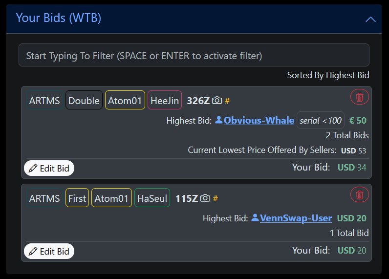 You'll be able to see the highest open bids on any item types you own, as well as being able to search any item type to see what the highest open bids on it are. You'll also see the lowest prices anyone may be offering to sell it for and the prices for recent completed sales, so this will help the prices/bids to converge.